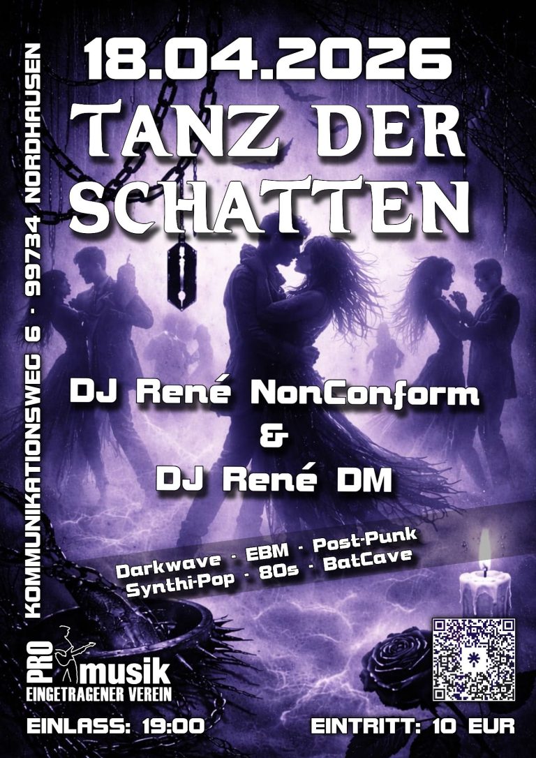 DJ René DM & DJ NonConform bringen euch Darkwave, Gothic, Post Punk, EBM, Industrial, Dark Classix, Synthi-Pop, Future Pop, Batcave & 80ties auf die Tanzfläche.
